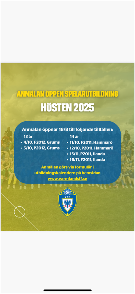 Här kommer datum och länk för höstens spelarutbildningar i VFF regi https://www.varmlandsff.se/utbildning/spelarutbildning/ /ledarna